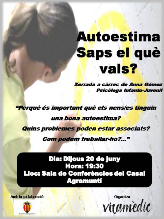 Des del centre Vitamèdic de Vilagrassa oferim una xerrada gratuïta a totes aquelles persones que vulguin tenir més informació sobre l’autoestima en els nens/es i adolescents, perquè és important una bona autoestima, quins problemes podem trobar associats, com podem treballar-ho…etc. La xerrada la realitzarà la psicòloga infanto-juvenil del centre, Anna Gómez.