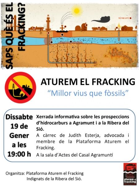 Divendres dia 18 de gener a la sala de conferències del casal d'agramunt a les 20 h tindrà lloc una xerrada informativa de la pràctica de diverses empreses que han sol·licitat permís a les nostres comarques per perfoar el territori per extreure gas i petroli mitjançant la tècnica coneguda com "Fracking"